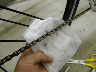 | この作業が一番厄介でした。(^^ゞ NEWチェーンにコネクトピンを差し込む作業。 Fをインナー、Rをトップにして チェーンのテンションが一番掛からない 状態で作業したんですが、なかなか。。(苦笑 |