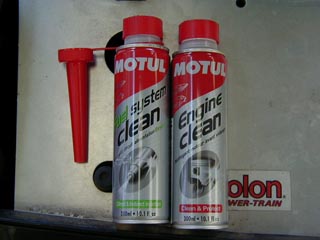 |  | 左の容器は「Fuel System Clean」とかいう ガソリンタンクに入れるヤツです。 主な効能は、水抜き効果と燃料系の洗浄剤みたいなものか? 右の容器は「Engine Clean」。 エンジン内に溜まったスラッジやカーボンを除去するヤツです。 圧縮も洗浄作用により上がるとか・・・ | |