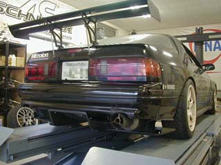 | 高くそびえ立つGTウィングとGTカーの プラモデルのようなデフューザー・・・。(^.^) リアからの眺めは30半ばのオヤジな車 ではありませんね。(汗 |  |