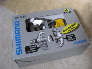 通販にて購入しました♪ シマノのSPDペダルです。 「SPD-SL」ってモデルもあったんですが、 こっちの方が私向きかと。。(笑 片面がフラットなので普通のスニーカーでも 使用できます。(^^)v 今回購入したモデルは 『シマノ PD-A530 SPDロードツーリングペダル』 楽天通販からの購入はコチラをクリック♪ |