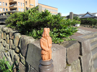 | 上の「ベイリーフ」の傍に 『幸橋』とよばれる橋があったので記念撮影♪ 橋の向こうの建物は平戸市役所です。 |