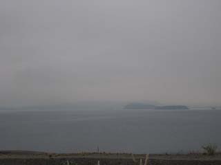 | 錦江湾の向こうに見えるのは 指宿の知林ヶ島です。 天気が良ければなぁ〜。(T_T) |