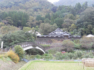 橋の上から藁葺き屋根を見たところ。 手前の山は展望台の建設途中!? この施設は、約1年前にオープンしたみたいです。 今後、宮崎県を代表するような名所になるのかな? |
