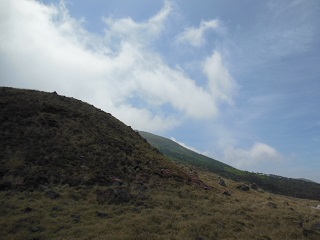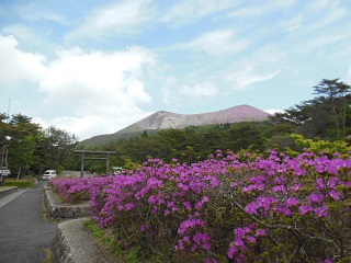 | 硫黄山。 所々、ムラサキ色な個所があるの わかりますかね? ミヤマキリシマの花が咲いてます♪ |