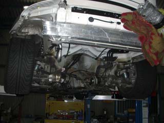 某雑誌に「エンジン降ろさないでも交換出来る」との 記載がありましたが、ショップの方と相談し、結局 エンジンを降ろす事になりました。 左の写真はエンジンが降りた我がGT3です。(汗 |