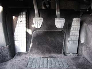 運転席の足元。 ちょっとべダル感覚が広めな印象でした。 996からクラッチとブレーキペダルが、 オルガン式から吊り下げ式に変更になってます。 |