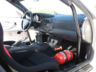助手席側からの写真です。 CS(クラブスポーツ)には純正ロールケージが ボルト止めにて装着されてます。 助手席の足元はCSでは標準装備の 消火器です。 デカイ・・・!(@_@) 消火器は使い勝手上、外さないとイケマセンね。(^^ゞ 街乗り時は。(苦笑 |