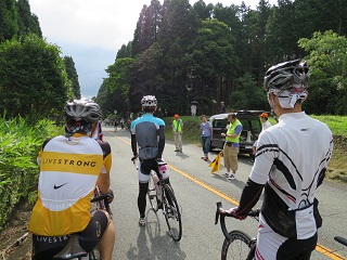 | 峠のCP・エイドポイントのとこは 奇跡的に(?)雨は上がってました。 しかし、ココから我々3人以外は誰とも 遭遇しません。 三味線女は言いました。 「コレ、イベントじゃなく、ただのサイクリングみたい」だと。 |