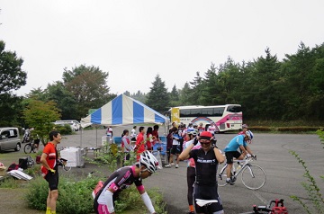 | 第二エイドです。 今年はバイクラックが設置されてました。 梨を頂く。 このヨーグルトのジュースは激ウマ! |