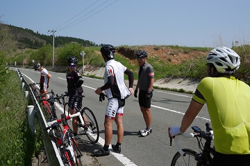 竹原峠からR442号線へ出たとこ。 ワッキーさんはRホイールがメカトラ。 私は数日前にパンクした箇所から再度エア漏れ。 修理が完全じゃなかったようです。(^^ゞ ココで時間はAM10:00過ぎくらい。 |