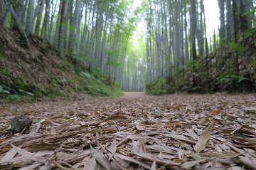 | 神秘的な竹林! 路面は竹の葉の落ち葉で 舗装路面が見えない状態。(・_・;) まさにフカフカ状態。 下りで直面してたら 滑って落車してたかも?(^^ゞ |