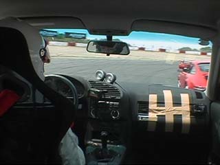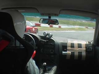 コースイン前、ピット前に整列です。 ダッシュボードにガムテを貼ってるのは、 走行時縁石等に乗った時に、ダッシュボードの 蓋がガパ〜〜っと開くのを防止する為です。 かな〜り、イケテマセンが・・・。(^^ゞ |