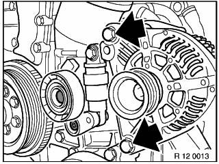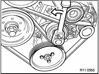 まずは、エアクリ&エアフロの取り外し。 作業する上で邪魔なのよね。(^^ゞ で、お次。 油圧式のベルトテンショナーなイズ号は 左図のようにしてベルトを緩め、外します。 #ココには通常樹脂製のカバーが付いてるのですが、 イズ号は外れてしまってて、ありませんでした。(^^ゞ ラチェットのサイズは16mmを使用しました。 |