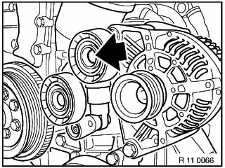 | 次にテンションローラーを外します。 ココも樹脂製のカバーを外し、 16mmのラチェットで外します。 |