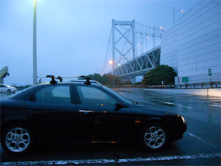 | 関門橋です。 やっと明るくなってきた♪ ココまでは濡れた路面ながらもハイペースで到着。 しかし、霧と豪雨が酷くなり・・・ 本州が見えんやんけぇ〜!(爆 |