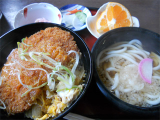 「柿の木茶屋」というとこに入ったら、 ボリュームのあるカツ丼食べちゃいました。(^^;; 780円! ミニうどんのダシが美味しかったっす♪ カツ丼も衣が薄くてヘルシーに美味しかった。 |