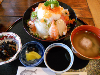 今日も昨日に引き続き、海鮮丼をオーダー。 コレで800円は安いっしょ!? エビ、イカ、お刺身をはじめ、沢山の海鮮モノの 上には白い山芋が掛かってます。 コレがまた美味しいんですねぇ〜♪ 大満足&お勧めメニューっす! v(*'-^*)bぶいっ♪ |