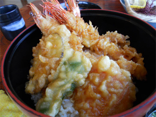コチラが名物(?)の「車海老天丼」1,300円。 もちろん、お吸い物等も付いてます。v(*'-^*)b 大きな車海老が3尾。 甘いタレが掛かってて美味かったっす! |