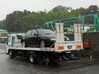 | さ、最後は俵山だ!と西原村の 小森付近の交差点に入ったトコで 原因不明のエンジンストップ!(*_*) JAFにTELしたり、知り合いの運送屋さんにTELしたり、 豪雨の中「押してあげましょうか?」と優しい声を 掛けられたり、「携帯電話持ってますか?」とも 嬉しい声も掛けていただいたり・・・・ 反面、睨まれたり、怒鳴られたり。(*_*)<交差点なので当然 結局、セルの力のみで邪魔じゃないトコへ 移動させて待機。(^^;; (MT車で良かったと思った。) 最終的には積載車でドナドナして頂きました。m(._.)m |