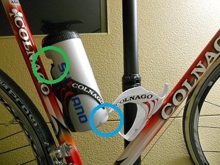 | 緑の○: カーボン製だから? ツール缶にバチッとフィットします。 もう落とすことはなさそう。(*^^)v 水色の○: 問題発生。 2つのホルダーが近過ぎるようで ボトルの下部が干渉しちゃいます。 むぅ〜〜、対策を考えんと。(^^ゞ 思わぬ落とし穴でした。(+o+) で、数日後。 施した対策はコレ!(^_-)-☆ |
