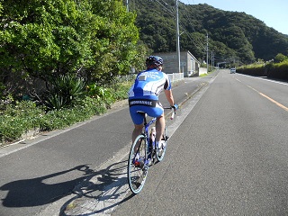 | ちょっくら逃げ切り状態になったんで、 峠の中腹で撮影タイム♪ M浦さん、快調に登って行きました。 |
