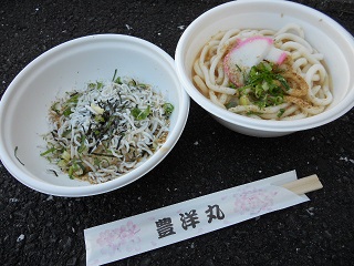 | 昼食会場でターボぅさんとM浦さんに 合流しました。 メニューは、しらす丼と ごまたっぷりのうどんっす! しらす丼かぁ〜・・・ 先月、角島行った時食ったな。(^^ゞ 美味かったっす! |