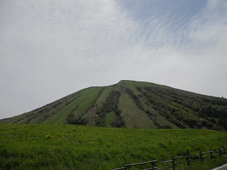 | 草千里の展望台んとこを強風に耐えながら ゆるりと上り、ココからは一気にGOAL地点まで ダウンヒル〜♪ 風が強くて正直怖かった。 米塚です。 |