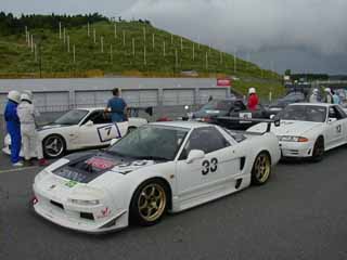 ご存知、前回の覇者のHさんのNSXです。 今回もツワモノ達がわんさかでした。 NSXの横のゼッケン「7」はKAZUさんのFDっす! 今回はブロ〜覚悟の走行らしいです。(怖) |
