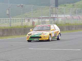 | オープニングラップです。 チェッカーが振られ、「てつぅさん」は追い越し開始! 私までもつられて2台抜いた。(笑) しか〜し、2人とも、1コーナーで黄旗に気付いた。(爆) 画像は黄旗無視しながら、ゾンビ号を追い越そうと するM’sのシビックです。(笑) |