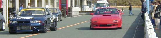 | タイムアタック開始です。 先頭はARIさん。 続いて、ゾンビ号にKAZUさんのFC3Sです。 あれ? 観客の方々の視線が、こっち向いてる。(苦笑) |