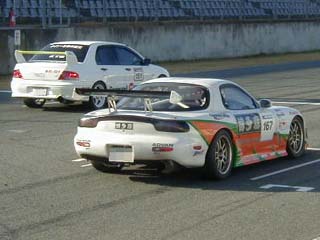 | ボンネ・カラー?のFD3Sの次に コースインするARI号。 今回は予選時に車が不調だったらしく、 中盤からのスタートです。 |