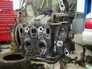 タービン、EXマニを取った状態のエンジン本体、 ショートブロックの状態です。 こうしてみると、RX-7の13Bエンジンは、かなり小さい。 それにしても、汚いなぁ〜。(^^ゞ |