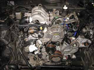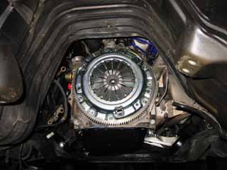 | 後方から、エンジン側を覗いた様子です。 正面に見えるのは、新品の強化クラッチカバーです。 #コレもまたAUTOEXE製(^^ゞ |