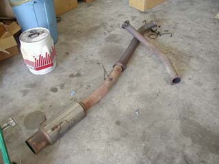 コレが今回取外したFパイプ(プロフ)とマフラー(柿本改)です。 とにかく五月蝿い組み合わせでした。(^^ゞ マフラーは2年しか使ってないのでまだまだ使えそうでした。 |
