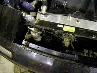 | まずは後期用のタンクを外します。 右の画像は外した後の写真です。 これでダイレクトにエアコンのコンデンサーに 風が当たるようになりました。(^^ゞ #水温も下がる事、間違いないでしょうけど・・。(笑) |