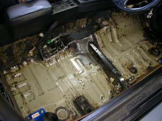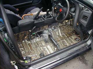 | 2週間ほど前に発覚した雨漏りの影響で運転席側のカーペット (内装)を剥ぎ取りました。 で、運転席側の足元だけアンダーコートを剥した状態でした。 今回はPITの待ち時間の間(1時間くらい)に残りの作業を・・・。 アンダーコートを剥すのは約10年振り。 そう、ゾンビ号購入直後にリアのアンダーコートを剥したのを 思い出しました。(^^ゞ |