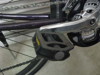 | 装着後の写真。 う〜〜、カッコ良くなって来ました♪ 見栄え重視?(爆 ちなみに・・・ 左側のペダルが左ネジ。 右側のペダルが右ネジなんですね。(^^ゞ |