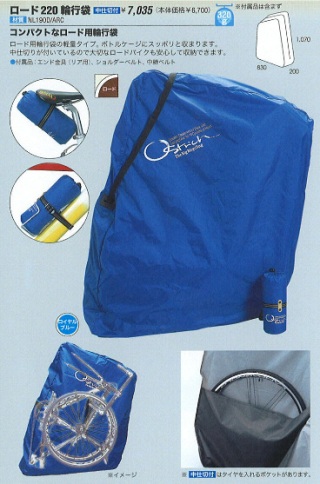 | まだ購入したばかりで広げてないのですが、 実際使用するときはこんな感じになるんでしょうね。 (右図はカタログより拝借) 同じオーストリッチで、他にも 「SL-100」「L-100」「ロード320」「ロード520」と あるんですが、エンド金具付と価格で、今回は 「ロード220」をチョイスしました! メーカー(オーストリッチ)のサイトには 現在、輪行袋の使用手順の 動画もアップされてますね。 結構簡単そう・・・♪(・ε・)/ |
