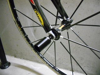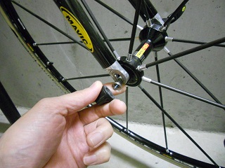 | 取付場所はココ。 赤○部分に装着します。 クイックレバーの反対側のキャップ部です。 |