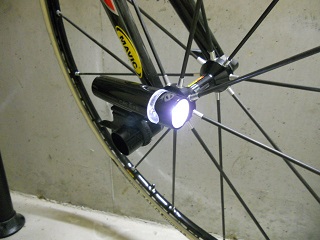 | 数年前に購入したライトを装着してみました。 ライトが明るくないので・・・ですが、 無いよりマシでしょ!?(^_-)-☆ |