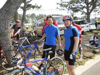 | スタート直前、遅れてターボぅさんが到着。 フロアポンプが故障して、バタバタ準備で 既に汗を沢山掻いてました。(苦笑 ※写真左:はまけんsan、右:ターボぅさん。 写真撮る時はサングラスをかけましょう。 モザイク入れるのが面倒臭いっす!(爆 |