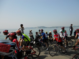 | 最後の休憩所の後は自分と同じくらいのスピードの人を発見! コバンザメのような走法でゴール直前の奈多海岸付近まで 引っ張ってもらいました♪ おかげで、脚は全く問題なしの絶好調!v(*'-^*)bぶいっ♪ ゴール直前も速い人についていき、最後の最後でAv40km/h走行を 2kmくらいできました。 |