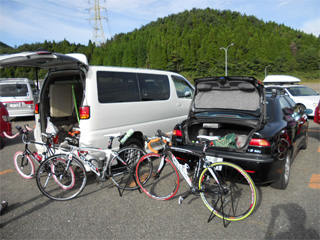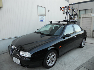| お隣さんのサービスカー(?)エルグランドとAlfa156。 BIKEは左から、お隣さんのミニベロ、 レオレオさんのKHARMA、 私のKHARMAです♪ |
