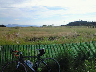 | 最初は車道側に止めてたんですが、風で倒れて 手摺(?)に立てました。 転倒で、フレームとフォークとバーテープに傷が。(涙 シューズも脱いで長めの休憩を取りました。 |