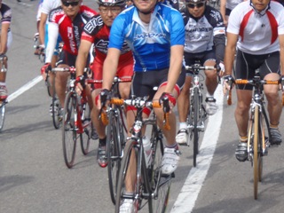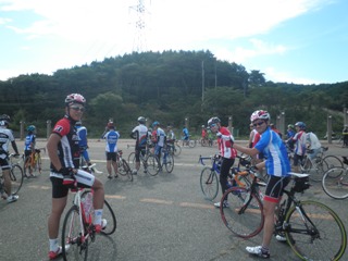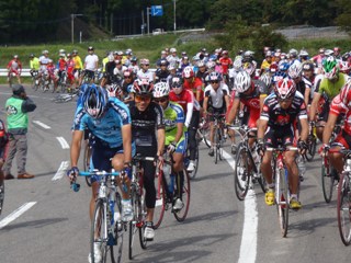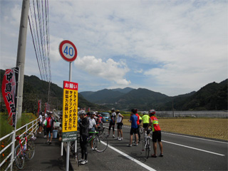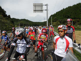 | スタート地点は落車等の危険を考え、ちょっと 下った県道になりました。 私、結構、前の方に位置してます。(^^;; |