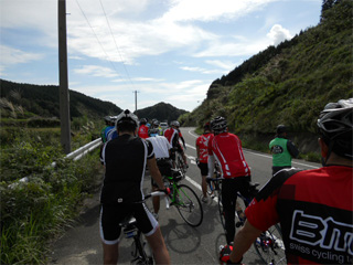 | 序盤の広域農道は走りやすかった。 基本的には下りなんですが、農道特有のアップダウンは ありました。 第一の難関、観音峠までは緩い登り。 あまりペースを上げずに黙々と走ったつもりなんですが、 峠に到達したトコで脹脛が両足ともピクピクっと! 嫌な予感。(>o<") その後はレオレオさんに先導してもらい、浜玉まで下り。 途中私たちよりちょっとペースの速い人が混ざって、 3人で走行しておりました。<唐津バイパスに出るまで (私は過去の失敗もあって、一番後ろの3番目) 唐津バイパスからは信号待ちで後ろから速い集団が・・w 6,7名くらいの集団になったでしょうか? 交互に先頭を交替し、40km/hペースで走ります。 (私は身体能力が低い為、1度も引っ張りませんでしたが。(^^;;) しか〜し、集団の一番後ろを走ってた私。 信号の手前で、この集団にちぎられ・・・・はい、それ以降 前に見える事はありませんでした。(涙 相知付近だったかな? 既にこの時、両足の脹脛はピクピクっとブレイクしてました。(◎-◎) |