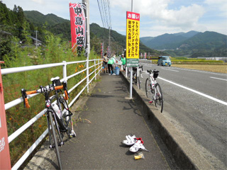 ゴールの瞬間です! もう顔がヘロヘロってますな。(苦笑 上の写真のとこから、辛かった。 激坂。 序盤の勾配は河内ダムに似てるかなぁ〜と 思いながら、順調に走ってましたが、 最後の最後、四阿屋コースの最後の激坂に 似た勾配が暫く続きました。 マジできつかったっす!(>o<") でも、無事に完走したもんね♪ 脹脛は攣ったけど、今回太もも攣らなかったもん。(笑 |