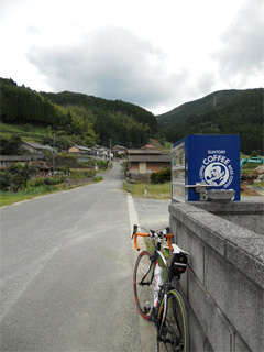 | 天山スキー場手前で細い道に入りました。 ココから噂では激坂が待ってるらしい。 前方を見ると・・・ ”あんな坂一気に登れるかよ!” 自販機前で屈伸運動。 私が心配になったみたいで、STAFFの方が 駆け寄ってくれましたが、「休憩してるだけですよ」と 言ったら、安心して元の位置(旗振り役)に戻って いきました。 |