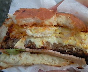 | 美味そうでしょ!? タマゴ、チーズ、ハンバーグ・・・etc。 具がいっぱいです。 コショウの効きがナイスなハンバーガーです♪!(^^)! |