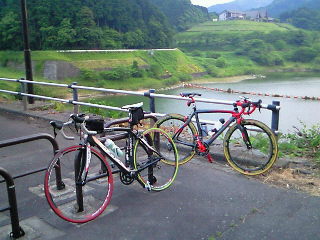 | 河内ダムを下ってると、トモゾさんとすれ違いました。 今日は表側の河内TTする予定じゃなかったんですが、 走るはめに・・・。(◎-◎) ちゃ〜んとトモゾさんはダムのとこで 何やらむしゃむしゃ食べながら 待っててくれてました♪ しばし、会話を交わし記念撮影♪ トモゾさんのBIKEのホイールが かっちょブ〜でしたばい♪ トモゾさんとは今日で2回目の オフ会です。(笑 |